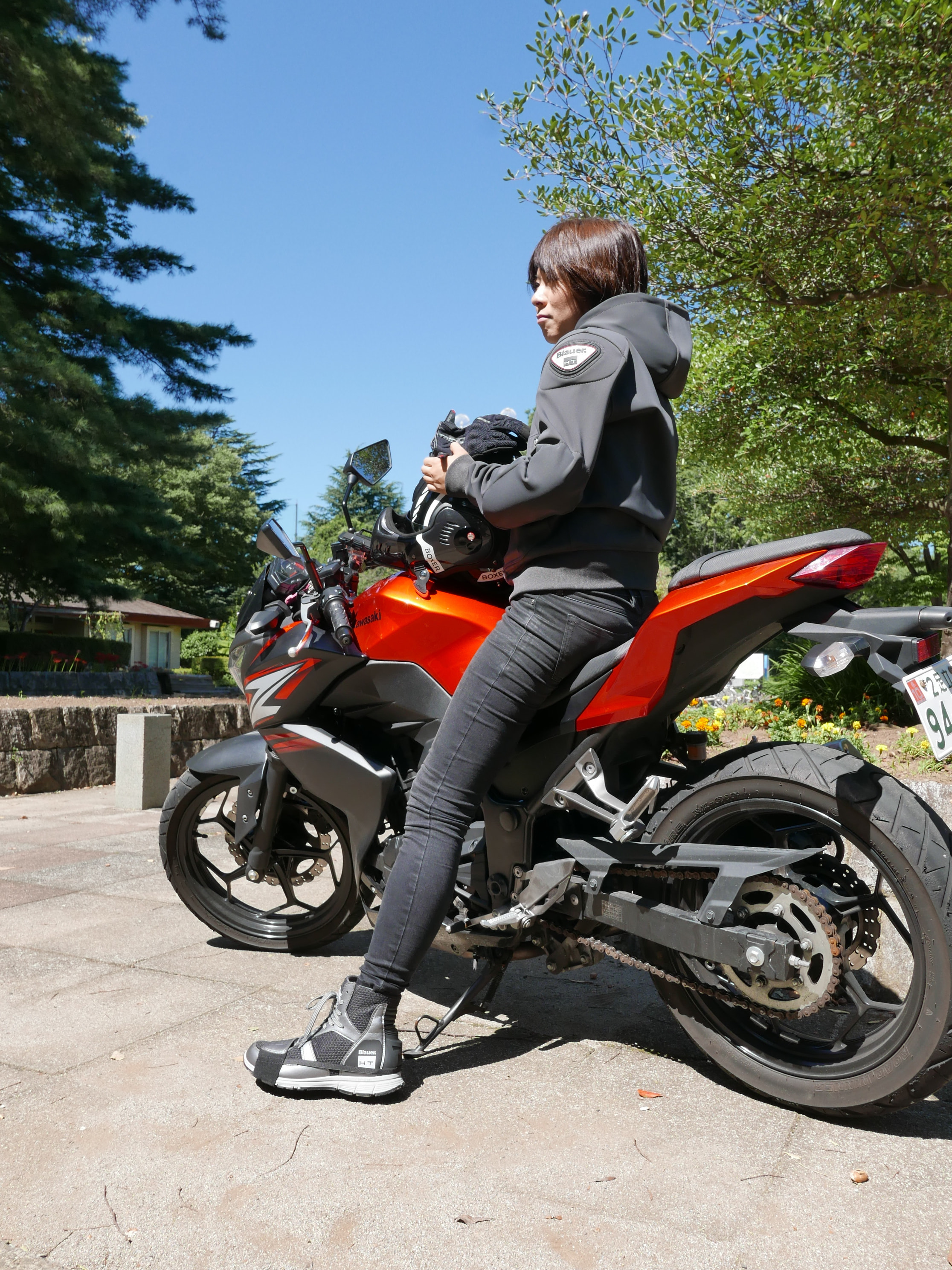 バイクに乗る服装と言うと、長袖長ズボンにローヒールのブーツ。安全のためにプロテクターが入っていれば尚よし。そんなイメージ。