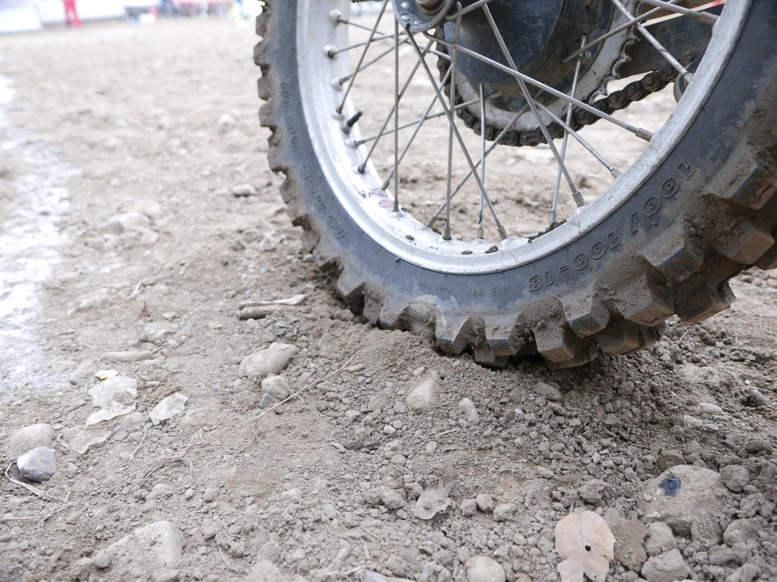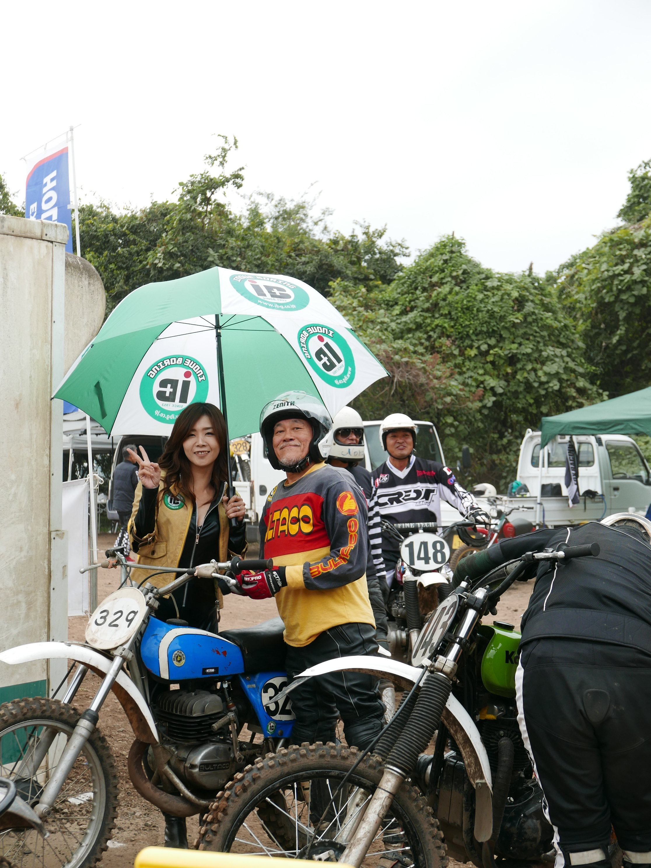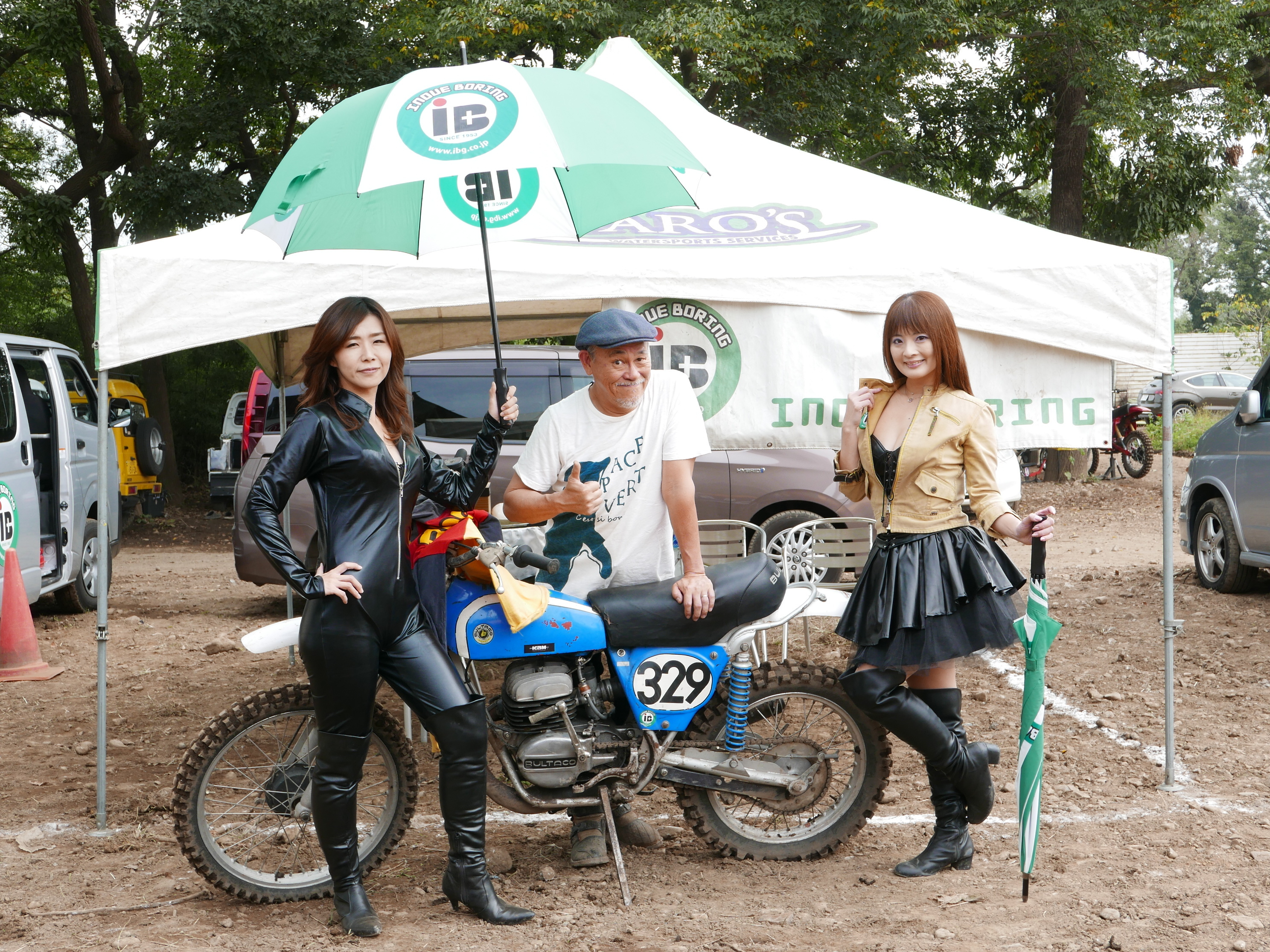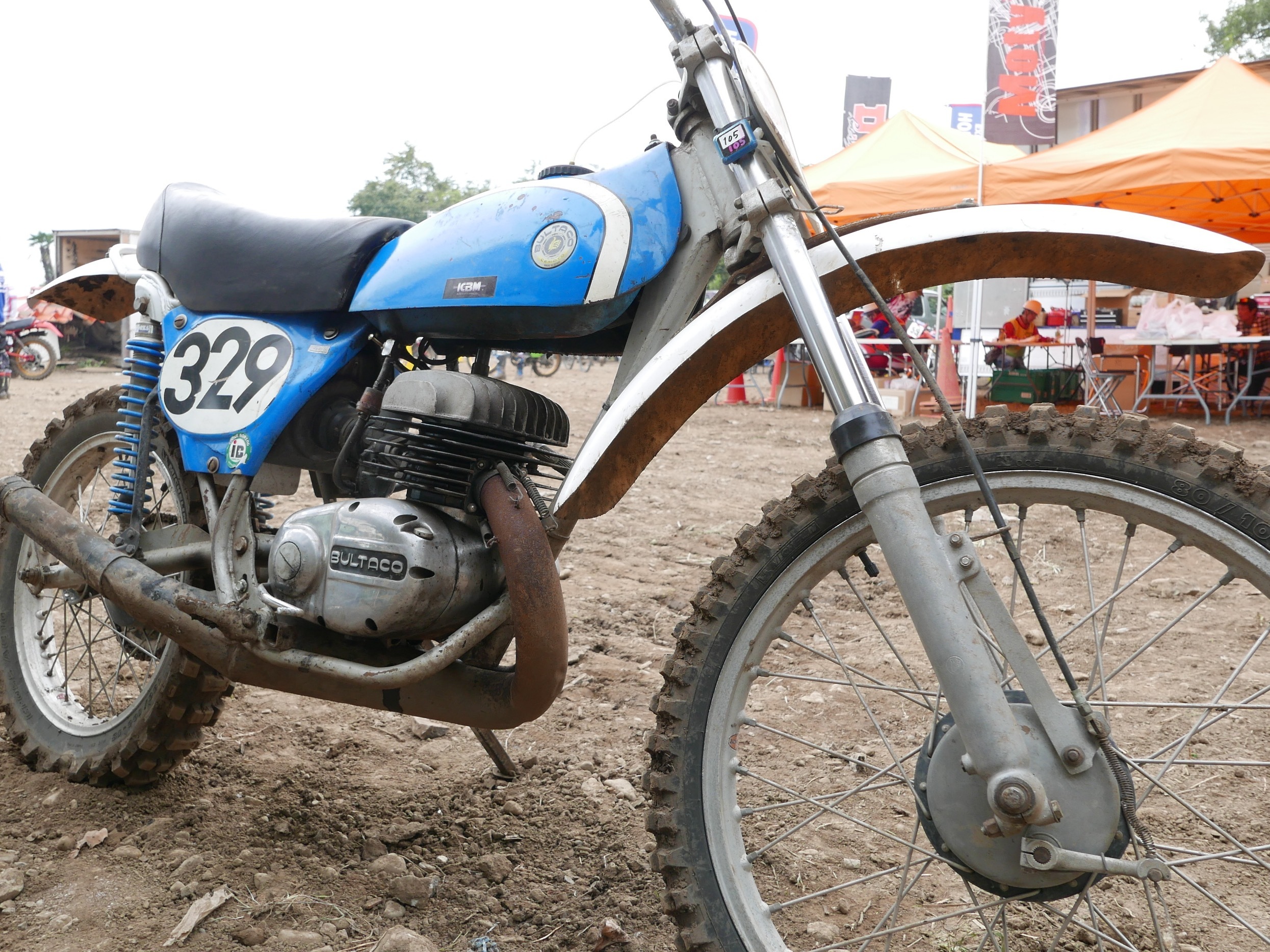 iB井上のマシンは1974年スペイン製のBULTACO Pursang MkVIIIです。まだサスペンションが長く長く進化する前の時代のマシンなので、跨ってかろうじて脚が地面につきます。空冷エンジン250ccでリアサスは2本(ツインショック)。