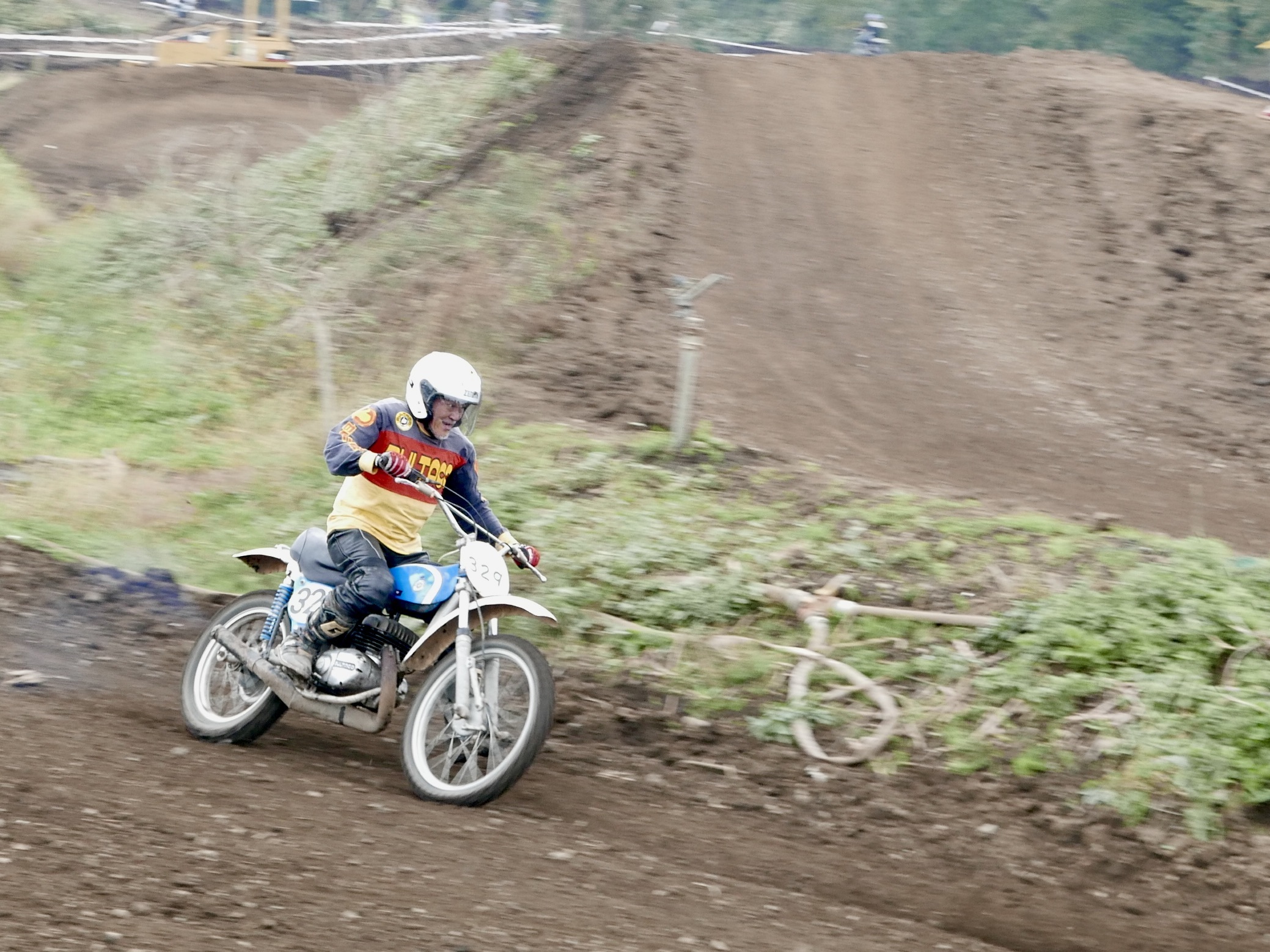 順位や勝敗などどうでもいいんですが、でも走るとなればやっぱりカッコよく走りたいので、頑張ってジャンプだって飛んじゃいます。旧くてもそこはモトクロッサー。ちょっと怖いくらい飛んでも着地ではふわっとサスが衝撃を吸収してくれます。ジャンプは愉しいですよね〜。モトクロスならでは。