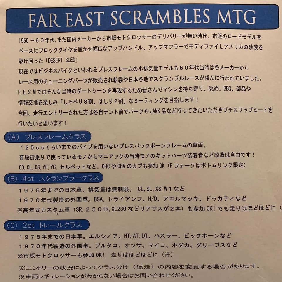 F.E.S.M.にはコース上の台数をコントロールするためかクラス分けはありますが、レギュレーションと言われるようなうるさい規則はありません。