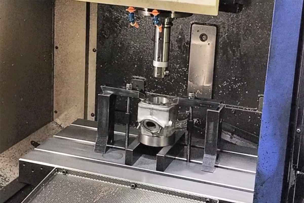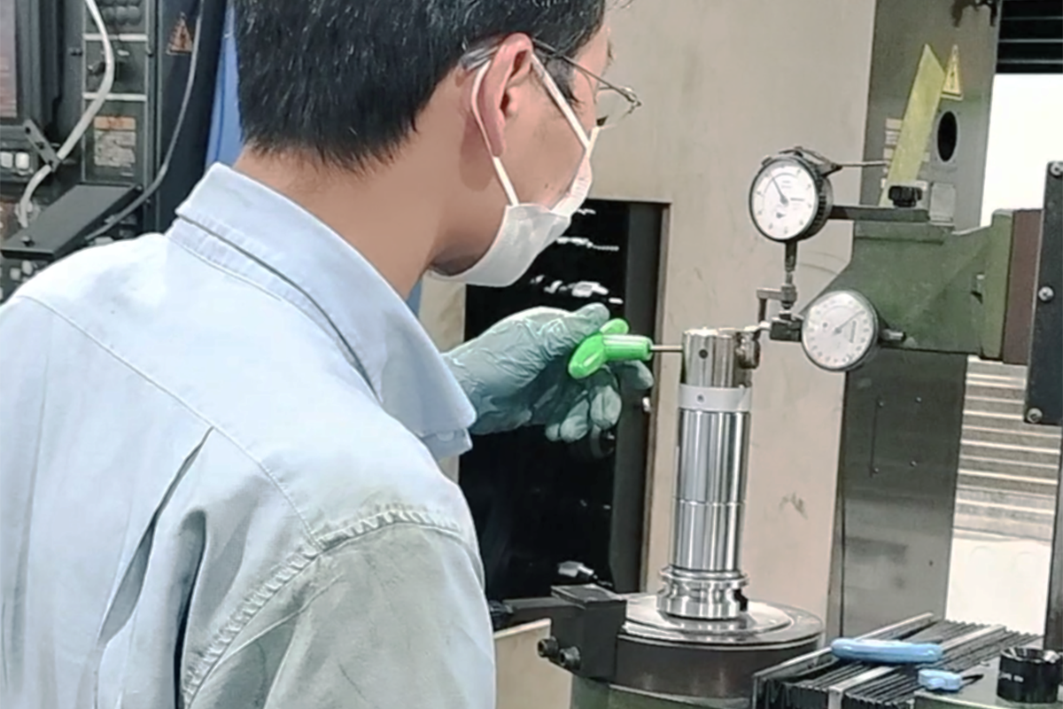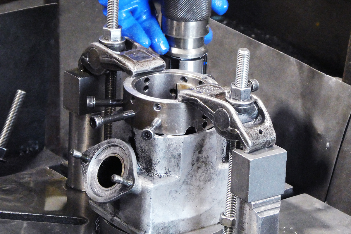 井上ボーリングでは、まずツールプリセッタで工具径を微調整。その後、シリンダー下面の掃除も兼ねて面出しをおこない、平らな治具の上に置いた際にガタつかない事を確認します。