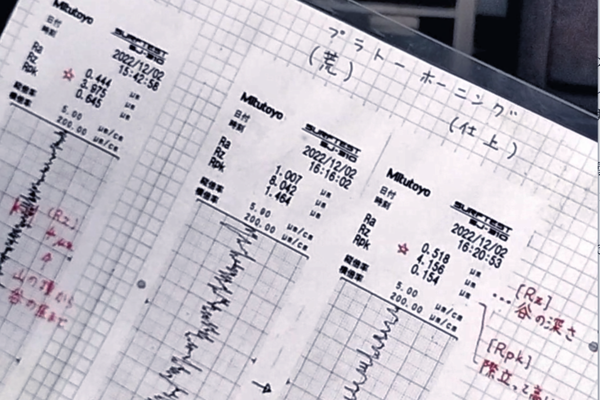 その後は何度も何度も機械を動かしては止め、微調整を繰り返しながら、荒削りのホーニング。さらに砥石を変えて、プラトーホーニングが行われていきました。