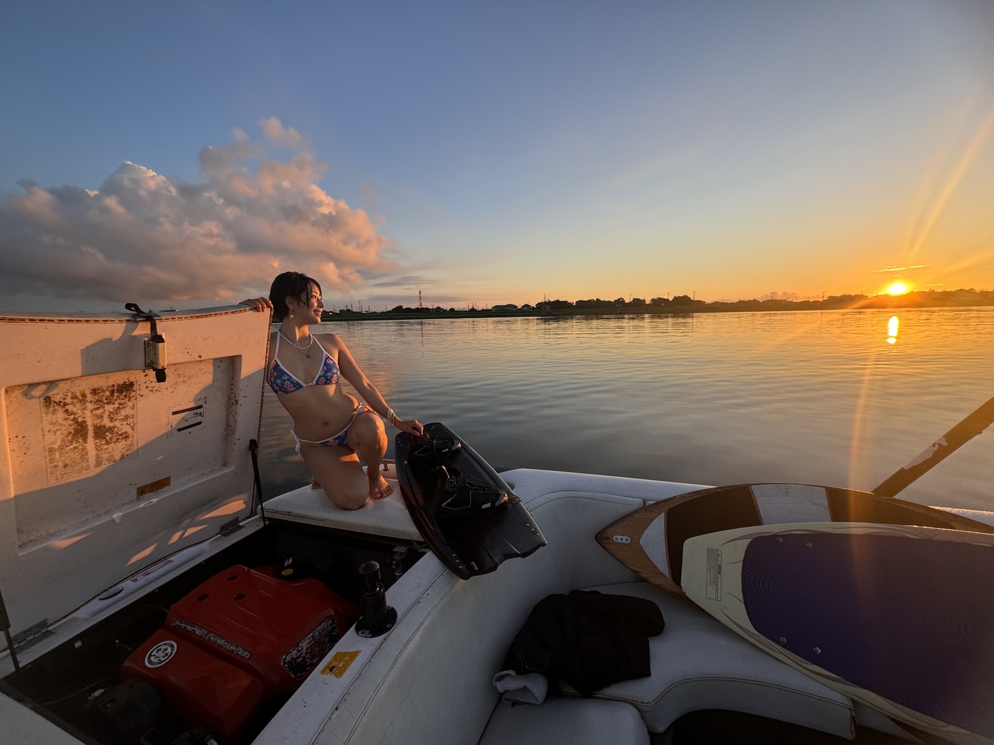 そして、RIHOさんにボートのドライビング・ウェイクボード・ウェイクサーフィン・ボートの上での撮影モデルまで務めてもらったその約1時間後には、全く空気が止まっていた水面にわずかですが風が出てグラスだった水面は漣立ち、あの夢のような水の上のパラダイスの風景は日の出後のいっときのピンク色に染まった雲と一緒にどこかへ消えてしまいました。そして、連日の茹だるような夏の日が始まります。