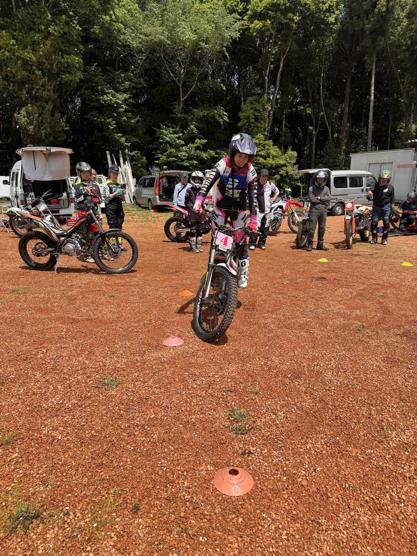 絵里加スクールは本当にトライアルのビギナーを大切に育ててくれるスクールになっています。毎回スクールのスタートは1番の基本であるスタンディングスティルから。そしてマーカーを置いて小さなターンからフロントアップの練習と続きます。お昼になるまで、みっちりと基礎の練習。