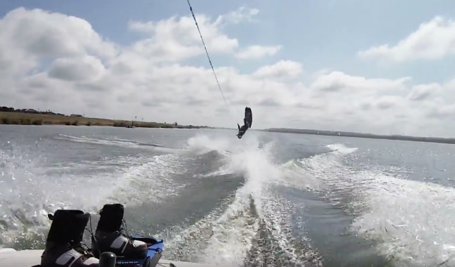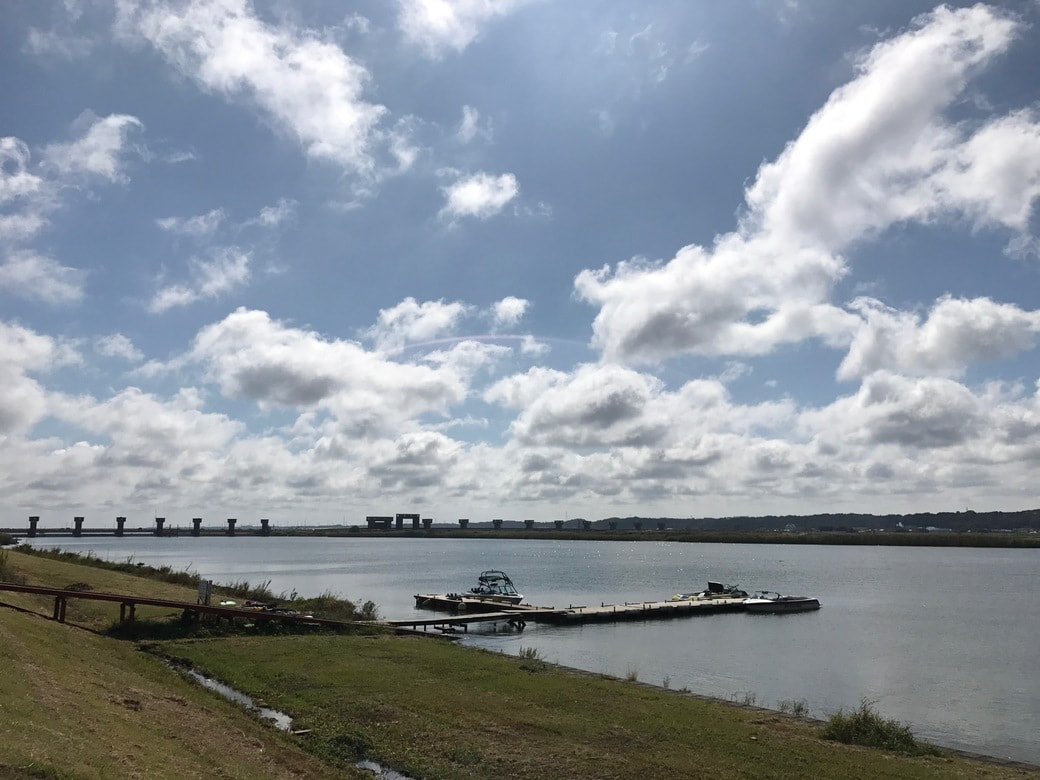 遠くから眺める桟橋とウェイク用ボート「スーパーエアーノーティク」。