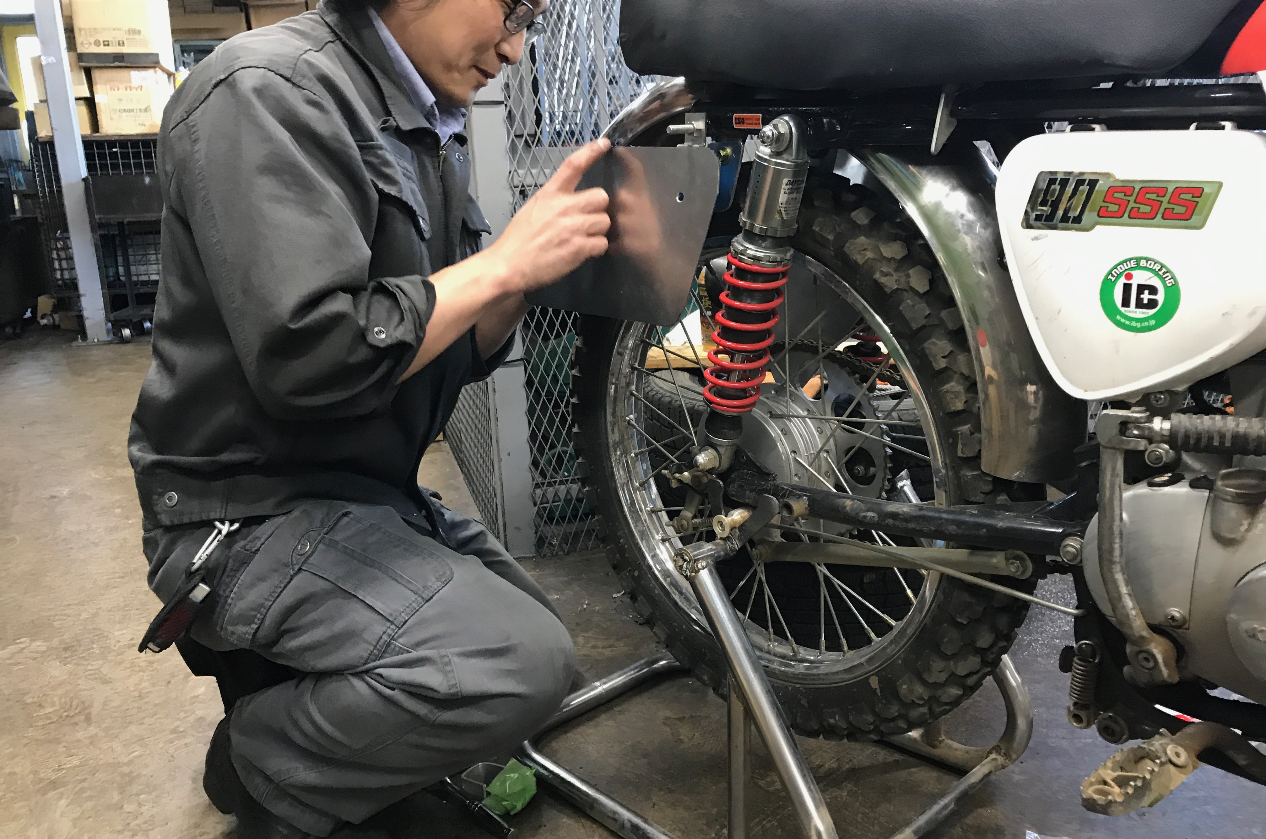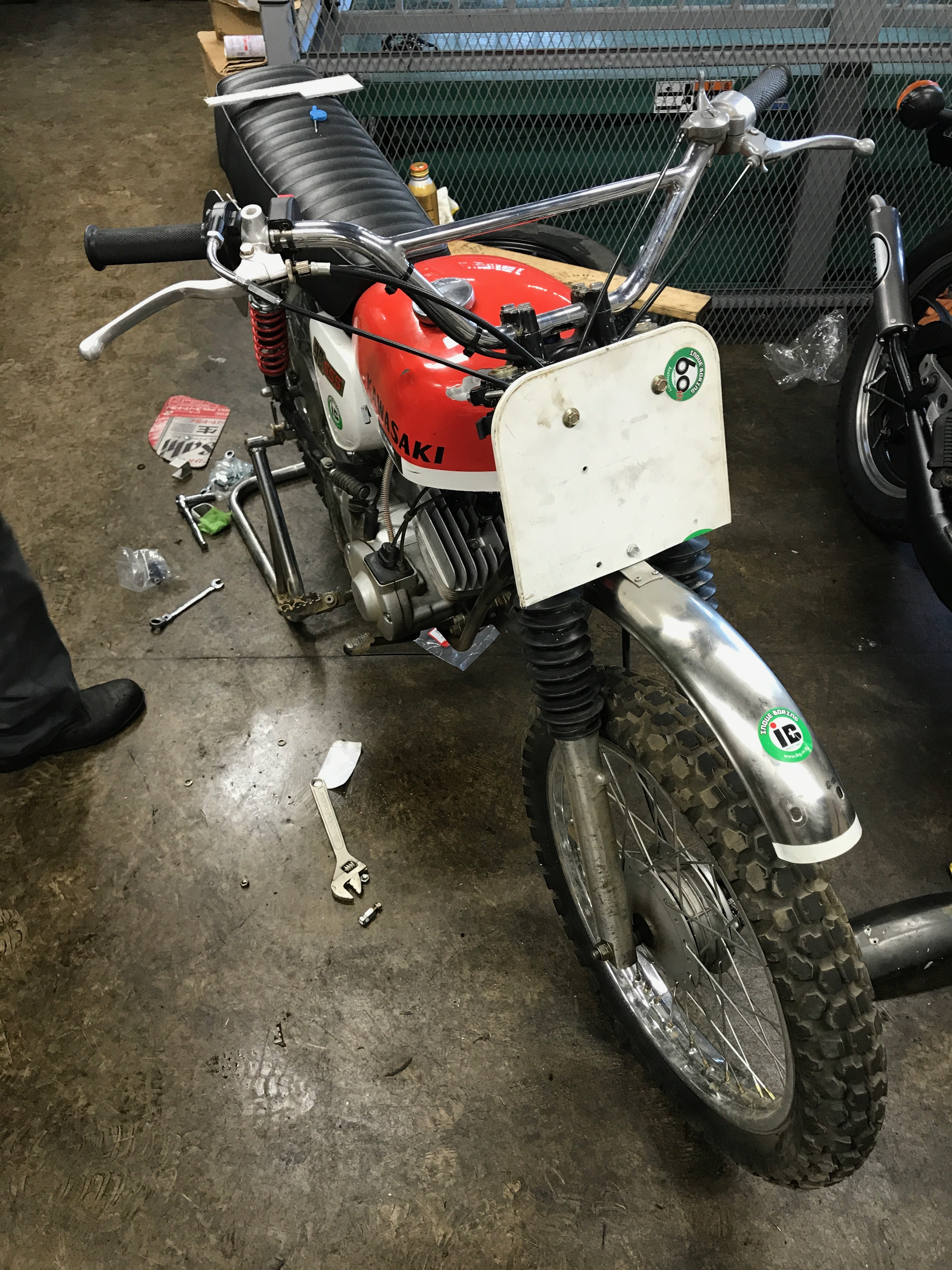 今回はiB 技師カメムラくんが中心になって、KAWASAKI 90sssを整備。ナンバーをつけたりしていますね。ちなみにシリンダーは熱対策ということでICBM(R)メッキシリンダーになっています。当日は雨でドロドロ!たいへんなレースになってしまいました。